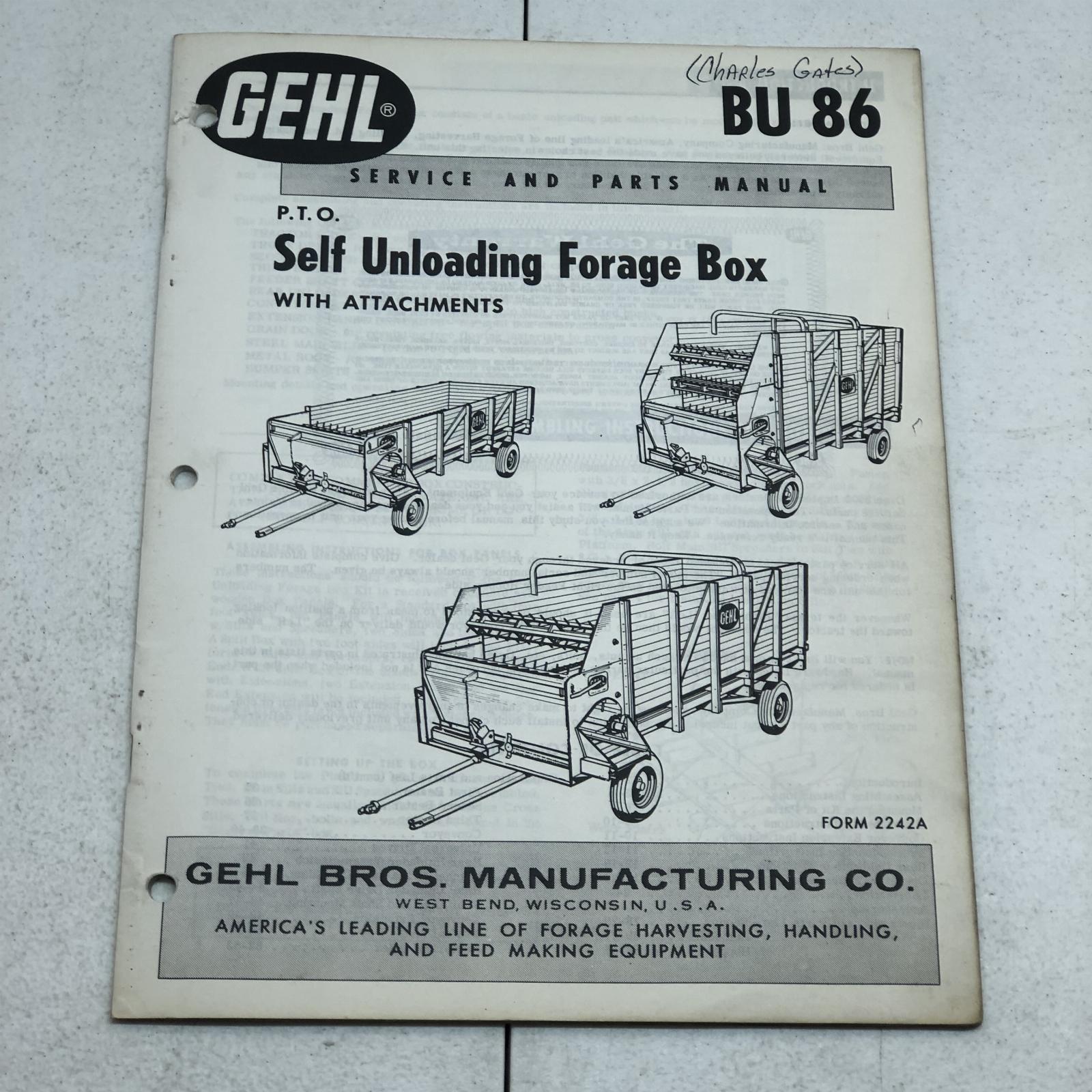Gehl BU86 Pto Self Unloading Forage Box Service Parts Manual