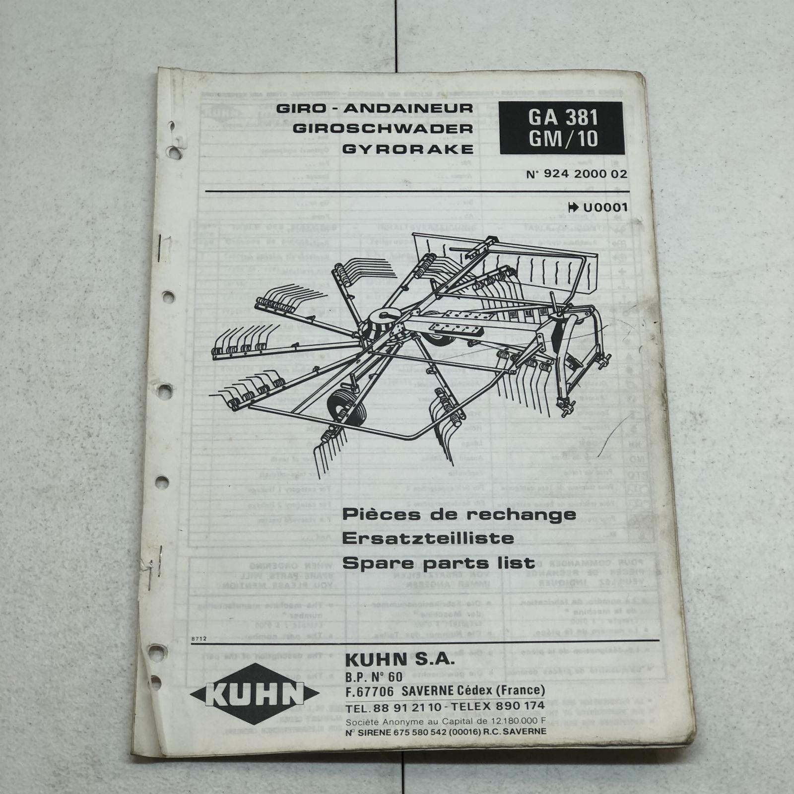 Kuhn GA381GM/10 Gyrorake Hay Rake Parts Manual
