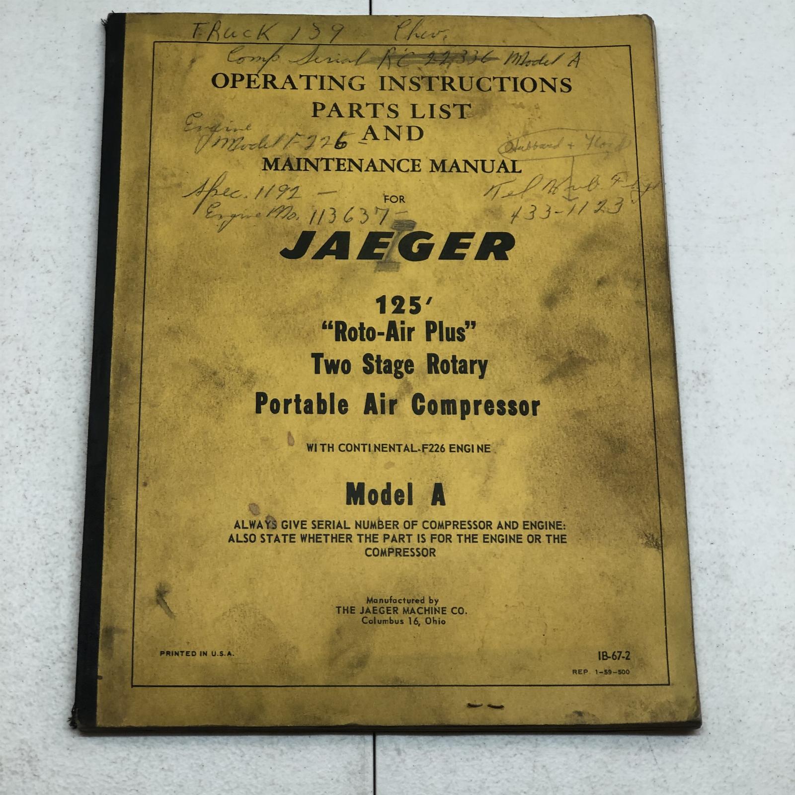 Jaeger 125 Roto Air Plus 2 Stage Rotary Air Compressor Model A Operators Manual
