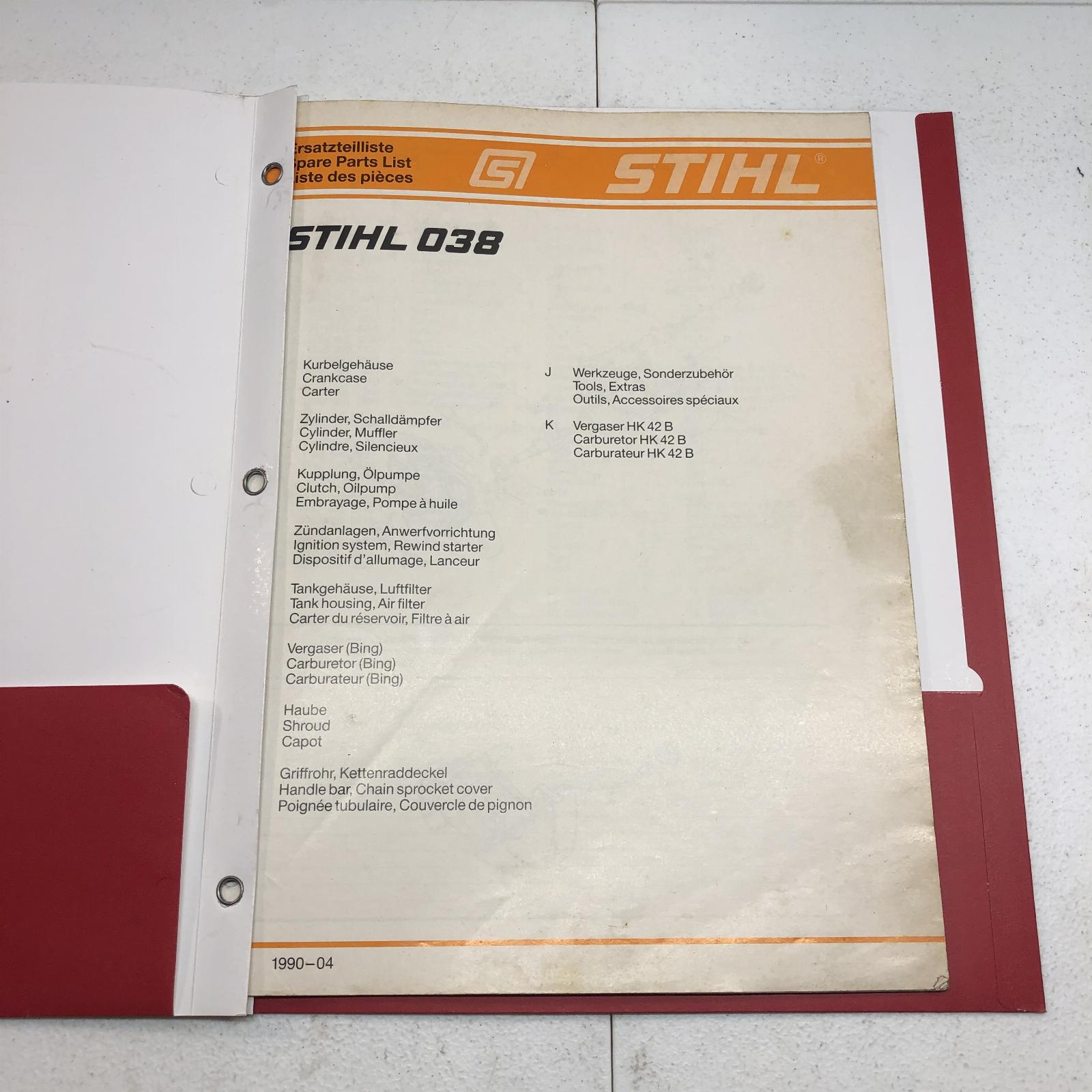 Stihl 038 Chainsaw Parts Manual Part No. 04521211323 33 Pages This Manual is the REAL DEAL and not a reprint. I recently purchased a huge lot of manuals from a 75+ year Massey Ferguson dealer that closed. This manual has been used in a repair shop and may have dirt, grease, fingerprints, writing, and smudging on some pages.