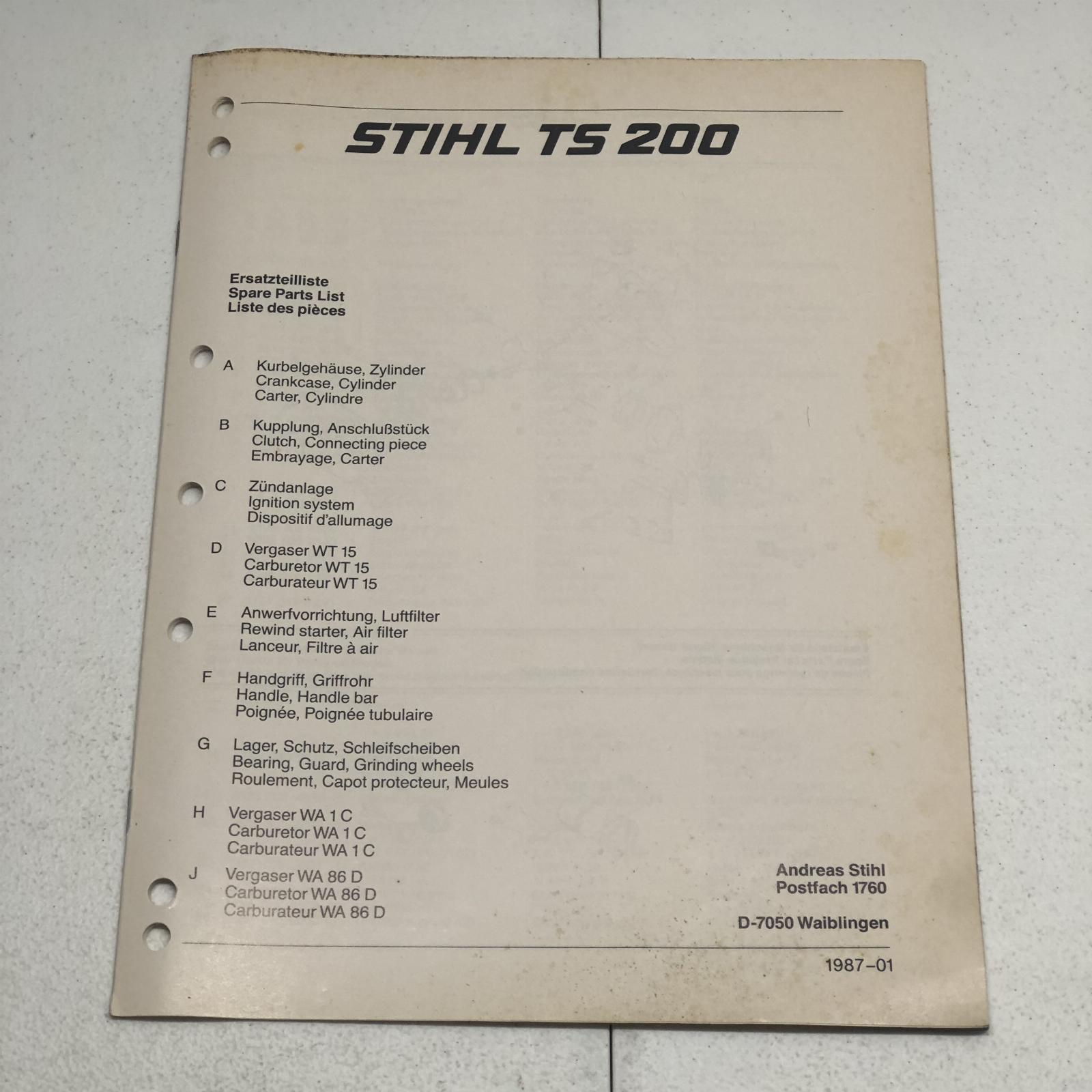 Stihl TS200 Cut-Off Saw Parts Manual Part No. 04523291323 27 Pages This Manual is the REAL DEAL and not a reprint. I recently purchased a huge lot of manuals from a 75+ year Massey Ferguson dealer that closed. This manual has been used in a repair shop and may have dirt, grease, fingerprints, writing, and smudging on some pages.