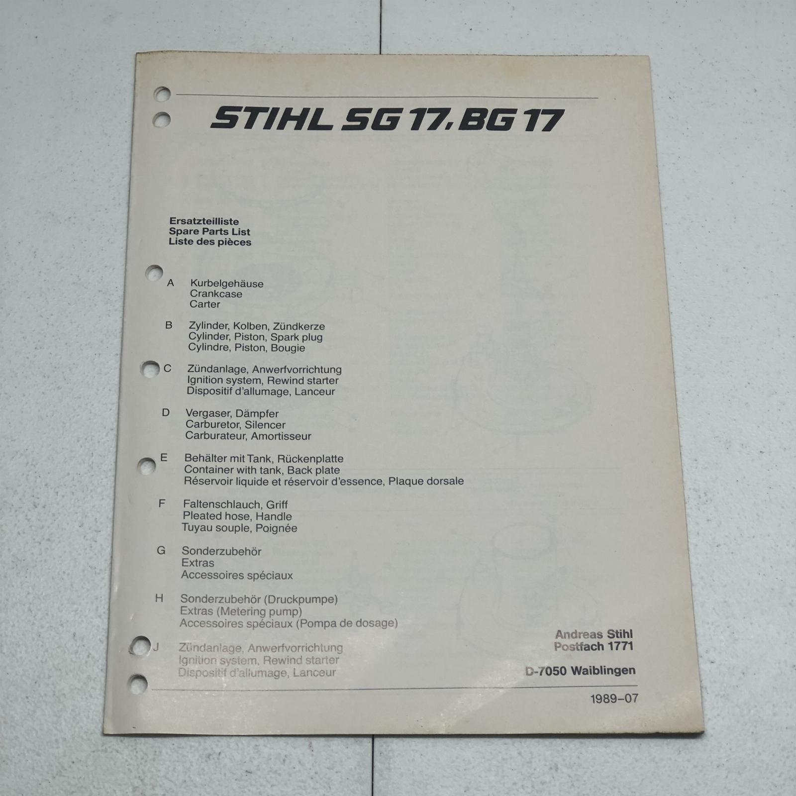 Stihl SG17 BG17 Mist Blower / Sprayer Parts Manual Part No. 04523221323 25 Pages This Manual is the REAL DEAL and not a reprint. I recently purchased a huge lot of manuals from a 75+ year Massey Ferguson dealer that closed. This manual has been used in a repair shop and may have dirt, grease, fingerprints, writing, and smudging on some pages.