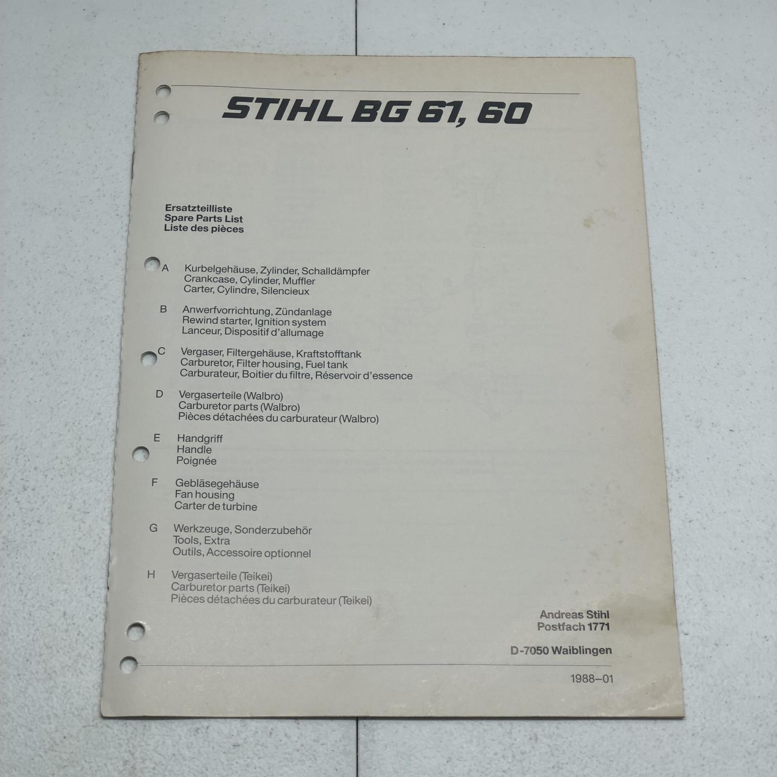 Stihl BG60 BG61 Blower Parts Manual Part No. 04523201323 17 Pages This Manual is the REAL DEAL and not a reprint. I recently purchased a huge lot of manuals from a 75+ year Massey Ferguson dealer that closed. This manual has been used in a repair shop and may have dirt, grease, fingerprints, writing, and smudging on some pages.
