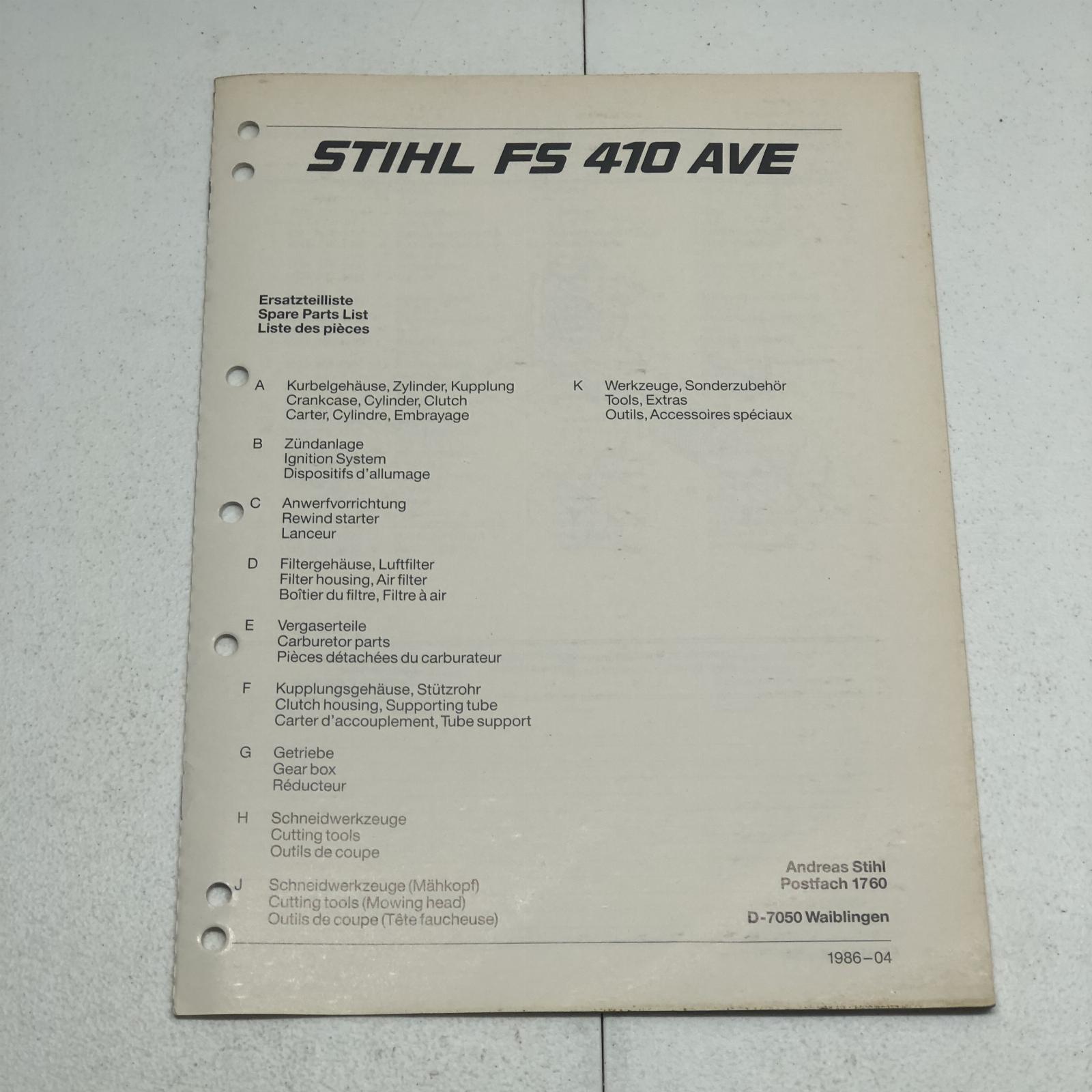 Stihl FS410 AVE Brush Cutter / Trimmer Parts Manual Part No. 04523171323 27 Pages This Manual is the REAL DEAL and not a reprint. I recently purchased a huge lot of manuals from a 75+ year Massey Ferguson dealer that closed. This manual has been used in a repair shop and may have dirt, grease, fingerprints, writing, and smudging on some pages.