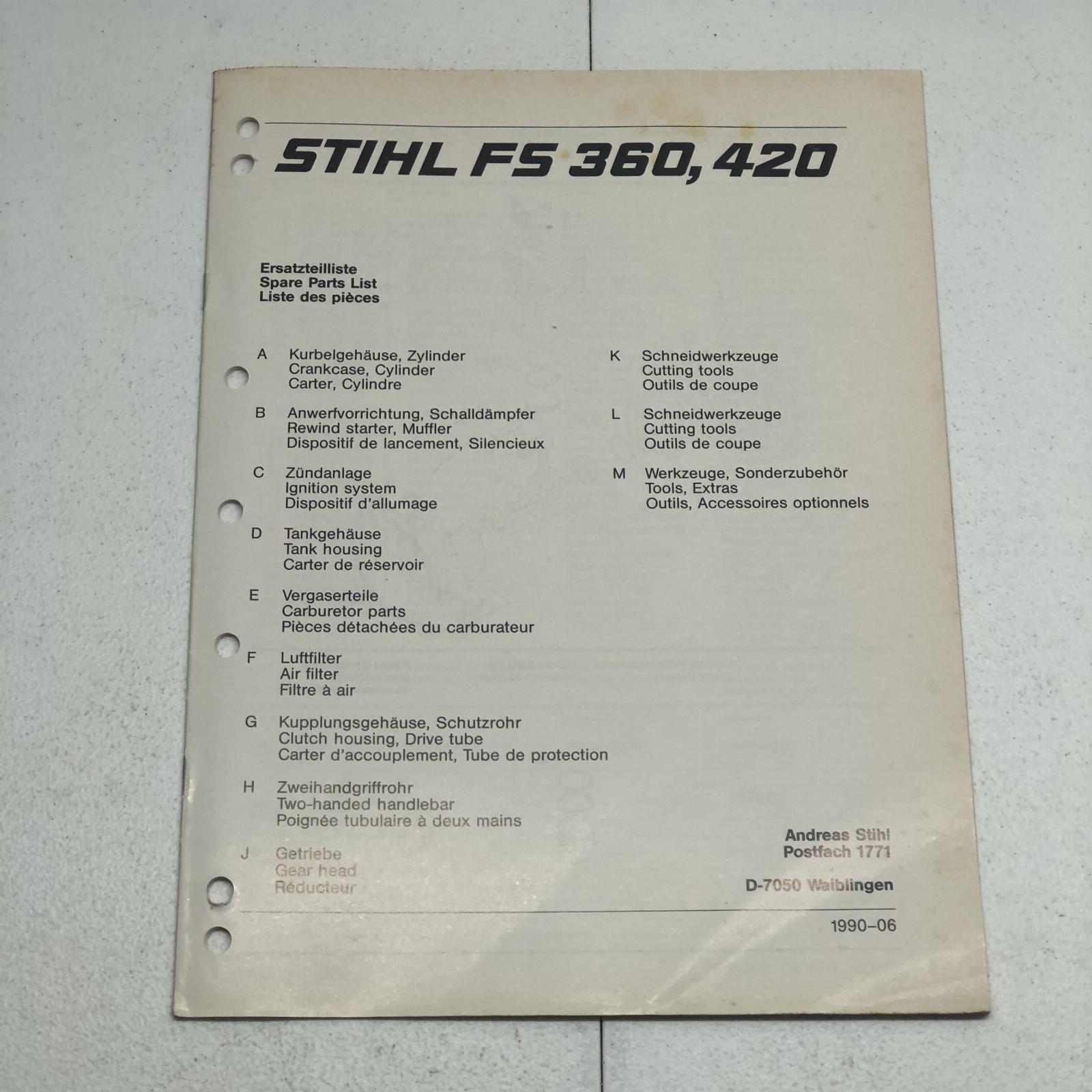 Stihl FS360 FS420 Brush Cutter / Trimmer Parts Manual Part No. 04523401323 25 Pages This Manual is the REAL DEAL and not a reprint. I recently purchased a huge lot of manuals from a 75+ year Massey Ferguson dealer that closed. This manual has been used in a repair shop and may have dirt, grease, fingerprints, writing, and smudging on some pages.