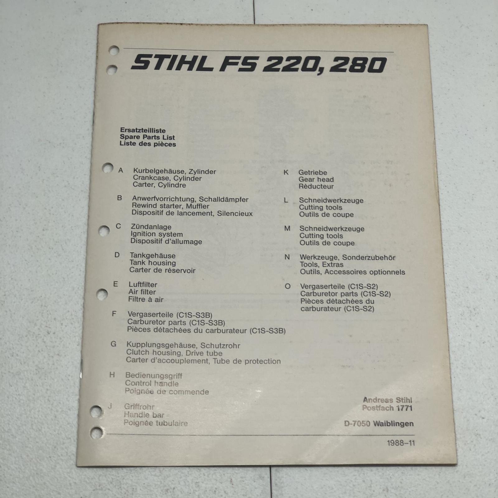 Stihl FS220 FS280 Brush Cutter / Trimmer Parts Manual Part No. 04523241323 29 Pages This Manual is the REAL DEAL and not a reprint. I recently purchased a huge lot of manuals from a 75+ year Massey Ferguson dealer that closed. This manual has been used in a repair shop and may have dirt, grease, fingerprints, writing, and smudging on some pages.