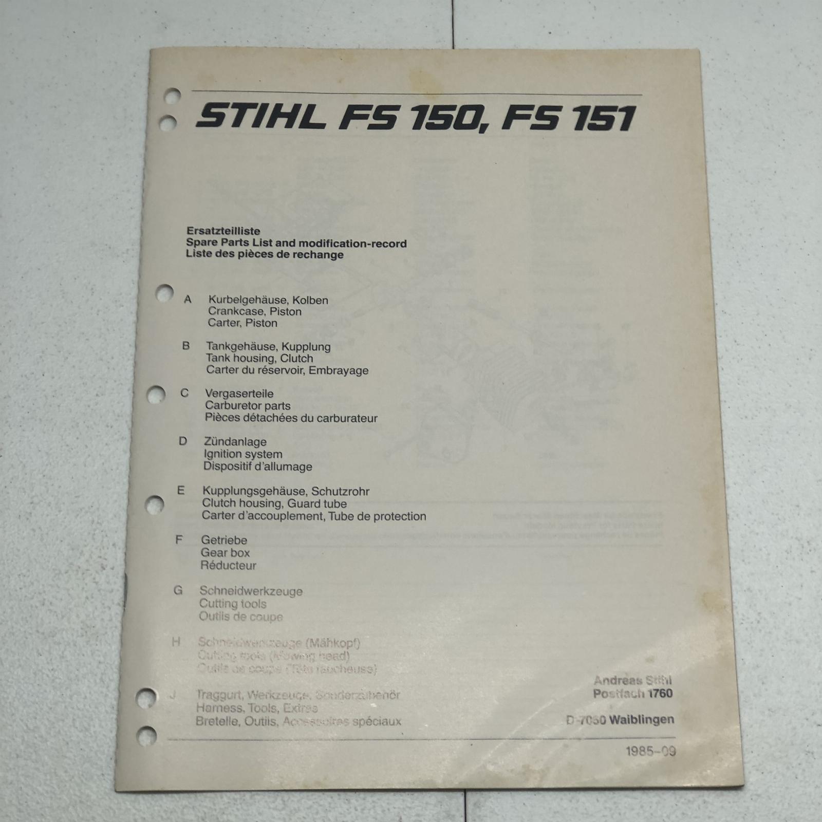 Stihl FS150 FS151 Brush Cutter / Trimmer Parts Manual 29 Pages This Manual is the REAL DEAL and not a reprint. I recently purchased a huge lot of manuals from a 75+ year Massey Ferguson dealer that closed. This manual has been used in a repair shop and may have dirt, grease, fingerprints, writing, and smudging on some pages.