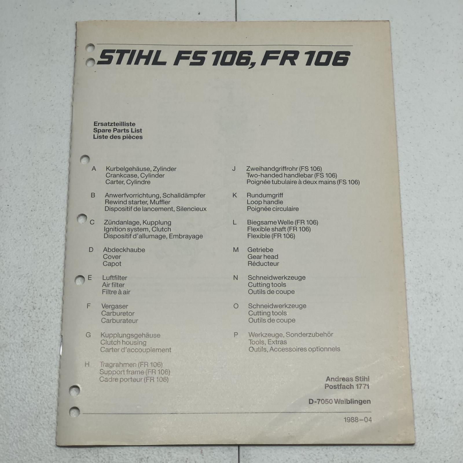 Stihl FS106 FR106 Brush Cutter / Trimmer Parts Manual 33 Pages This Manual is the REAL DEAL and not a reprint. I recently purchased a huge lot of manuals from a 75+ year Massey Ferguson dealer that closed. This manual has been used in a repair shop and may have dirt, grease, fingerprints, writing, and smudging on some pages.