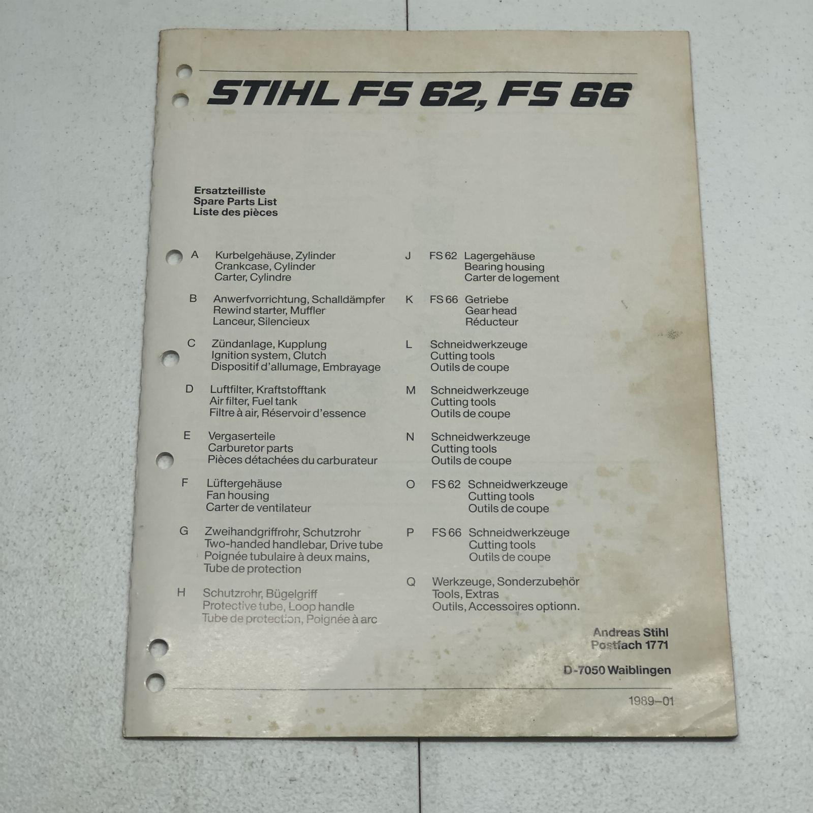 Stihl FS62 FS66 Brush Cutter / Trimmer Parts Manual Part No. 04523031323 39 Pages This Manual is the REAL DEAL and not a reprint. I recently purchased a huge lot of manuals from a 75+ year Massey Ferguson dealer that closed. This manual has been used in a repair shop and may have dirt, grease, fingerprints, writing, and smudging on some pages.