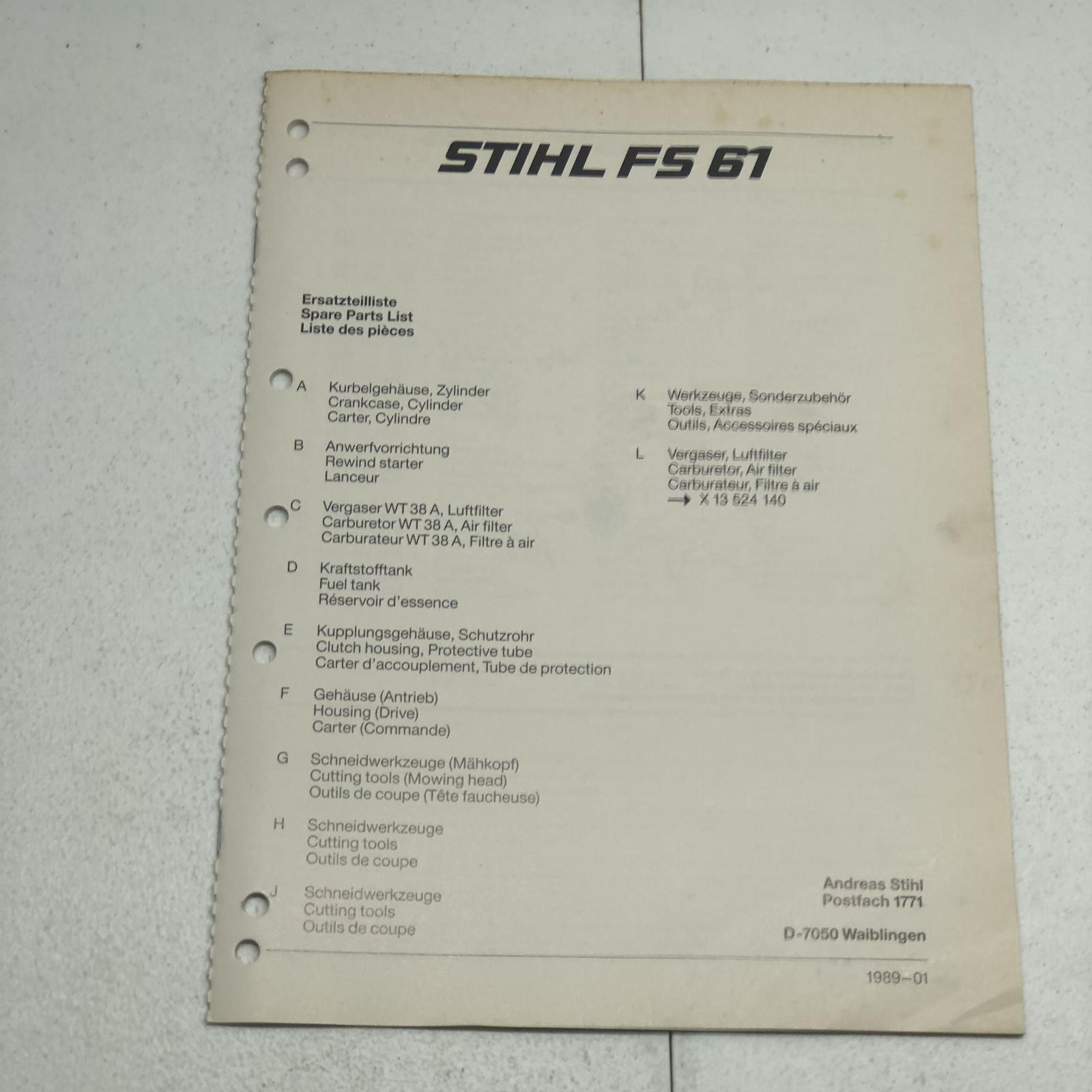 Stihl FS61 Brush Cutter / Trimmer Parts Manual Part No. 04523101323 31 Pages This Manual is the REAL DEAL and not a reprint. I recently purchased a huge lot of manuals from a 75+ year Massey Ferguson dealer that closed. This manual has been used in a repair shop and may have dirt, grease, fingerprints, writing, and smudging on some pages.
