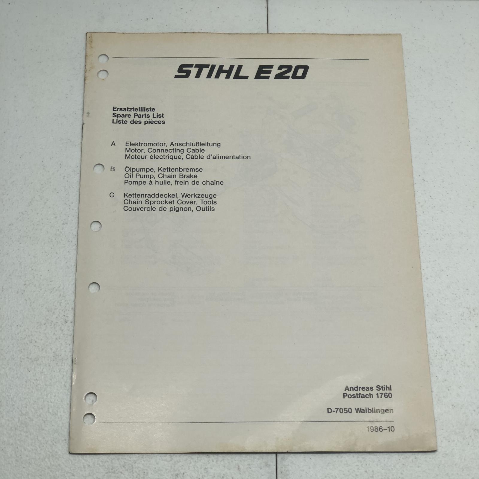Stihl E20 Electric Chainsaw Parts Manual Part No. 04521011323 11 Pages This Manual is the REAL DEAL and not a reprint. I recently purchased a huge lot of manuals from a 75+ year Massey Ferguson dealer that closed. This manual has been used in a repair shop and may have dirt, grease, fingerprints, writing, and smudging on some pages.