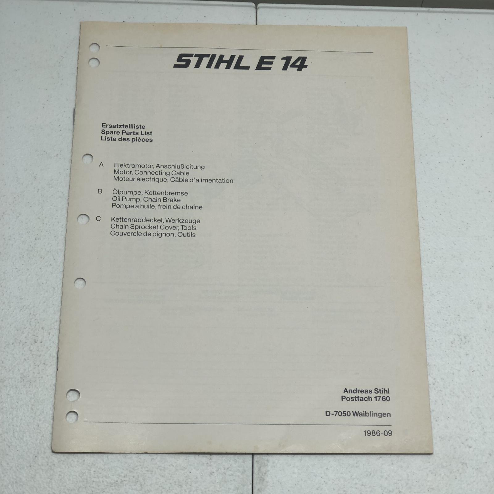 Stihl E14 Electric Chainsaw Parts Manual Part No. 04521051323 7 Pages This Manual is the REAL DEAL and not a reprint. I recently purchased a huge lot of manuals from a 75+ year Massey Ferguson dealer that closed. This manual has been used in a repair shop and may have dirt, grease, fingerprints, writing, and smudging on some pages.