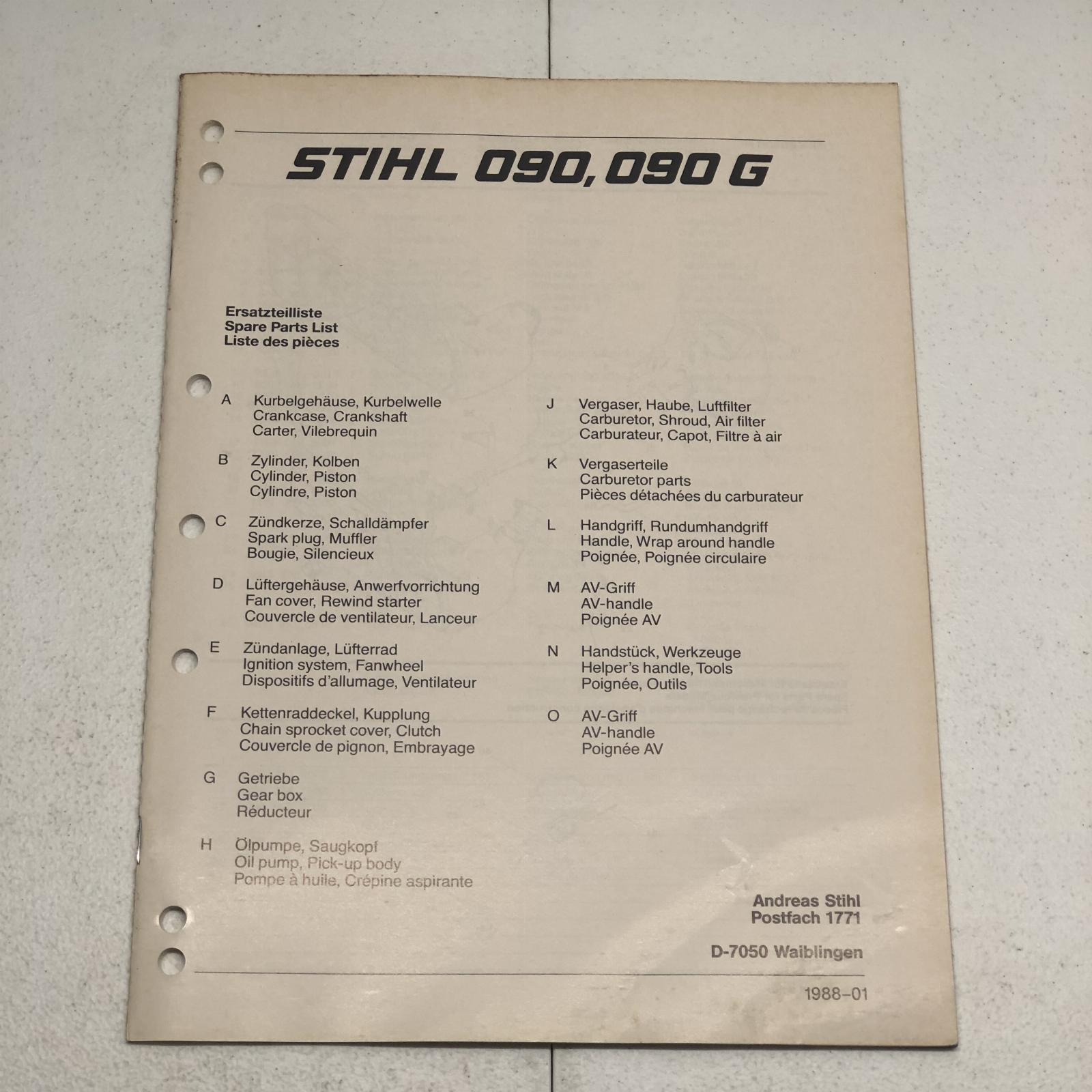 Stihl 090 090G Chainsaw Parts Manual Part No. 04521571323 47 Pages This Manual is the REAL DEAL and not a reprint. I recently purchased a huge lot of manuals from a 75+ year Massey Ferguson dealer that closed. This manual has been used in a repair shop and may have dirt, grease, fingerprints, writing, and smudging on some pages.