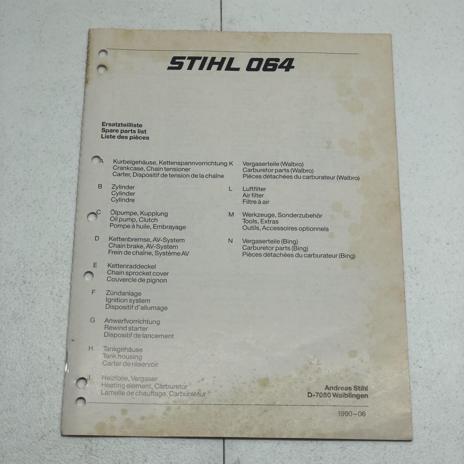 Stihl 064 Chainsaw Parts Manual Part No. 04521301323 27 Pages This Manual is the REAL DEAL and not a reprint. I recently purchased a huge lot of manuals from a 75+ year Massey Ferguson dealer that closed. This manual has been used in a repair shop and may have dirt, grease, fingerprints, writing, and smudging on some pages.
