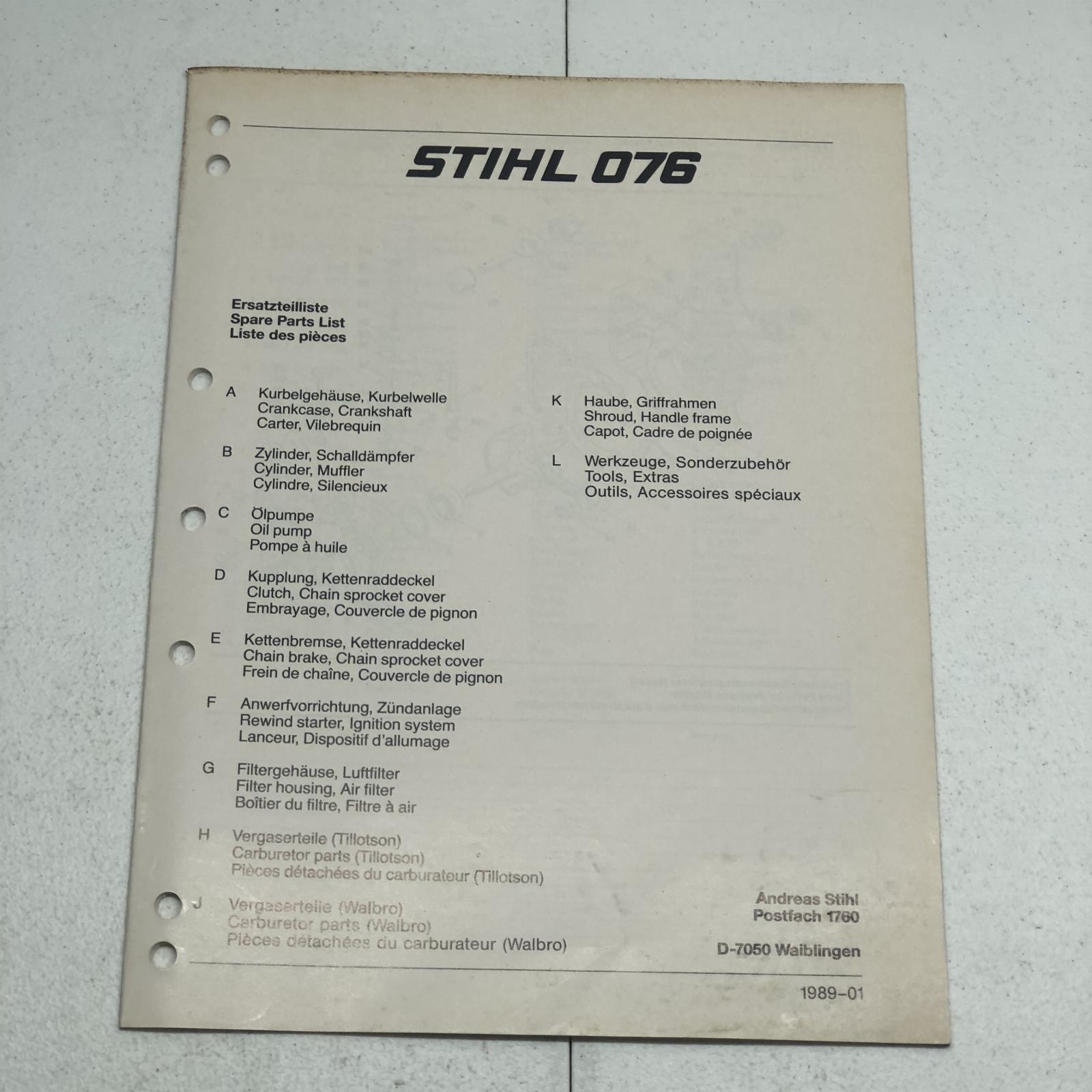 Stihl 076 Chainsaw Parts Manual Part No. 04521241323 36 Pages This Manual is the REAL DEAL and not a reprint. I recently purchased a huge lot of manuals from a 75+ year Massey Ferguson dealer that closed. This manual has been used in a repair shop and may have dirt, grease, fingerprints, writing, and smudging on some pages.