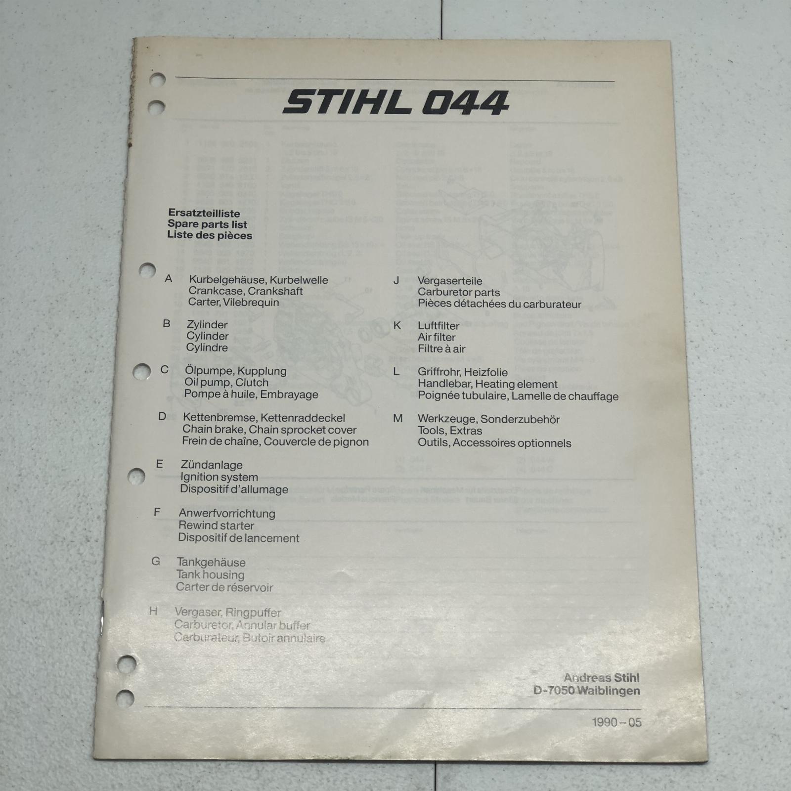 Stihl 044 Chainsaw Parts Manual Part No. 04521321323 25 Pages This Manual is the REAL DEAL and not a reprint. I recently purchased a huge lot of manuals from a 75+ year Massey Ferguson dealer that closed. This manual has been used in a repair shop and may have dirt, grease, fingerprints, writing, and smudging on some pages.