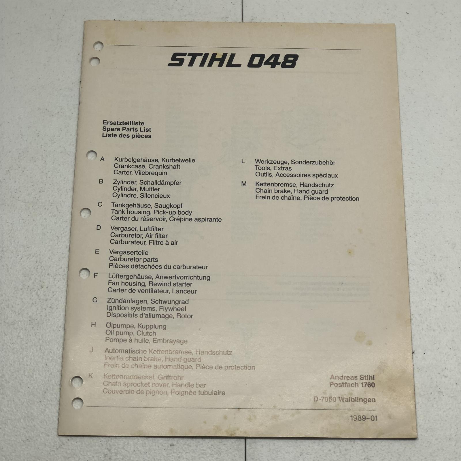 Stihl 048 Chainsaw Parts Manual Part No. 04521221323 29 Pages This Manual is the REAL DEAL and not a reprint. I recently purchased a huge lot of manuals from a 75+ year Massey Ferguson dealer that closed. This manual has been used in a repair shop and may have dirt, grease, fingerprints, writing, and smudging on some pages.