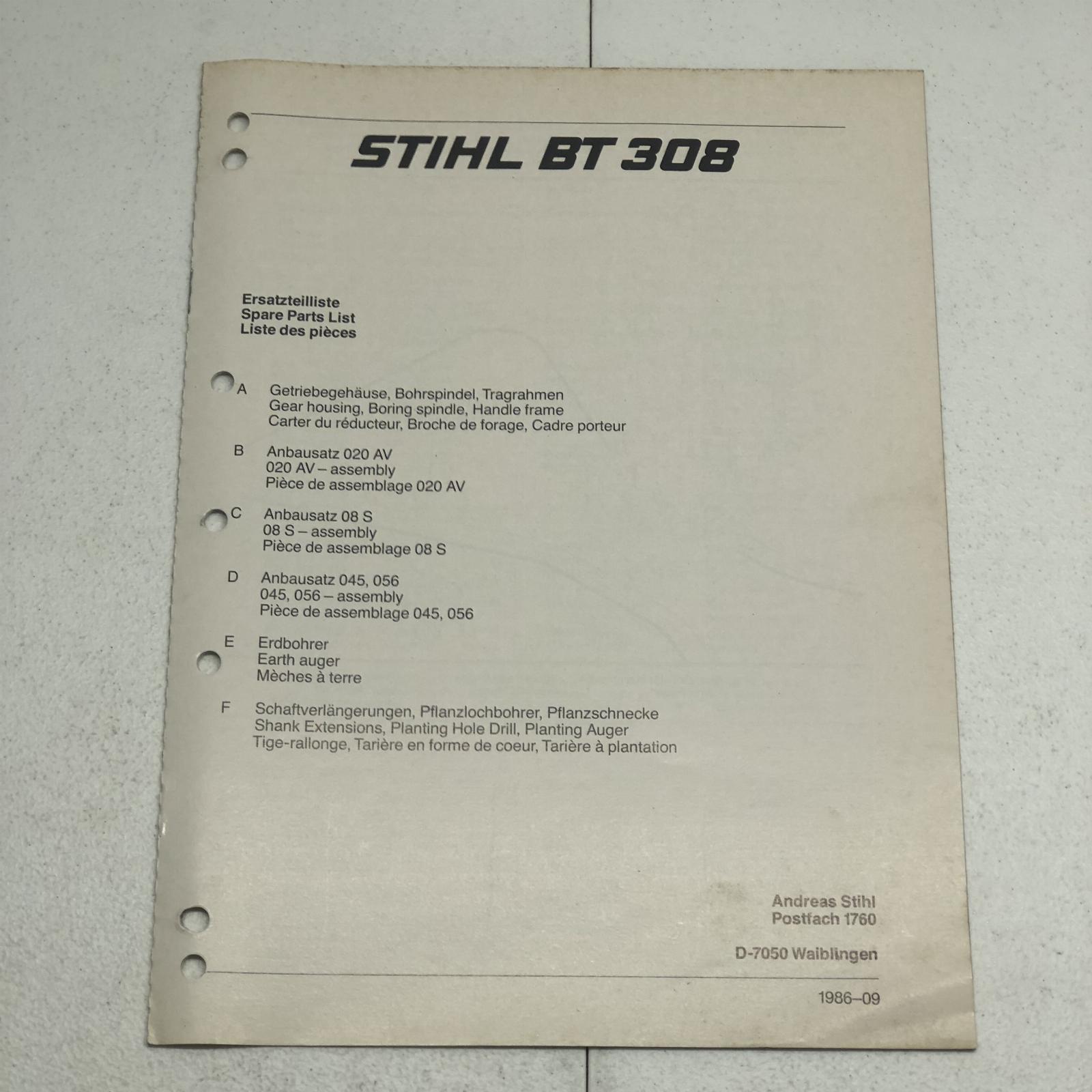 Stihl BT308 Hole Digger / Earth Auger Parts Manual Part No. 04524381323 15 Pages This Manual is the REAL DEAL and not a reprint. I recently purchased a huge lot of manuals from a 75+ year Massey Ferguson dealer that closed. This manual has been used in a repair shop and may have dirt, grease, fingerprints, writing, and smudging on some pages.