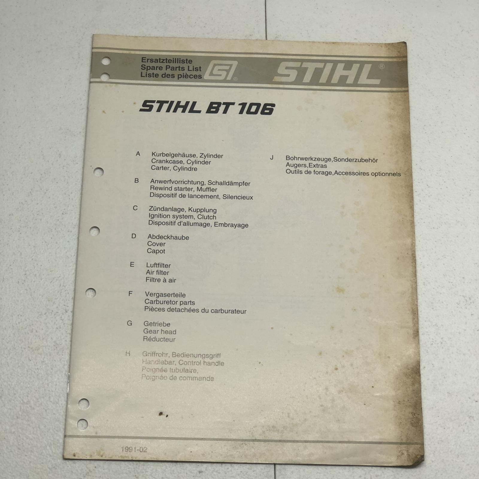 Stihl BT106 Earth Auger / Hole Digger Parts Manual Part No. 04524241323 19 Pages This Manual is the REAL DEAL and not a reprint. I recently purchased a huge lot of manuals from a 75+ year Massey Ferguson dealer that closed. This manual has been used in a repair shop and may have dirt, grease, fingerprints, writing, and smudging on some pages.