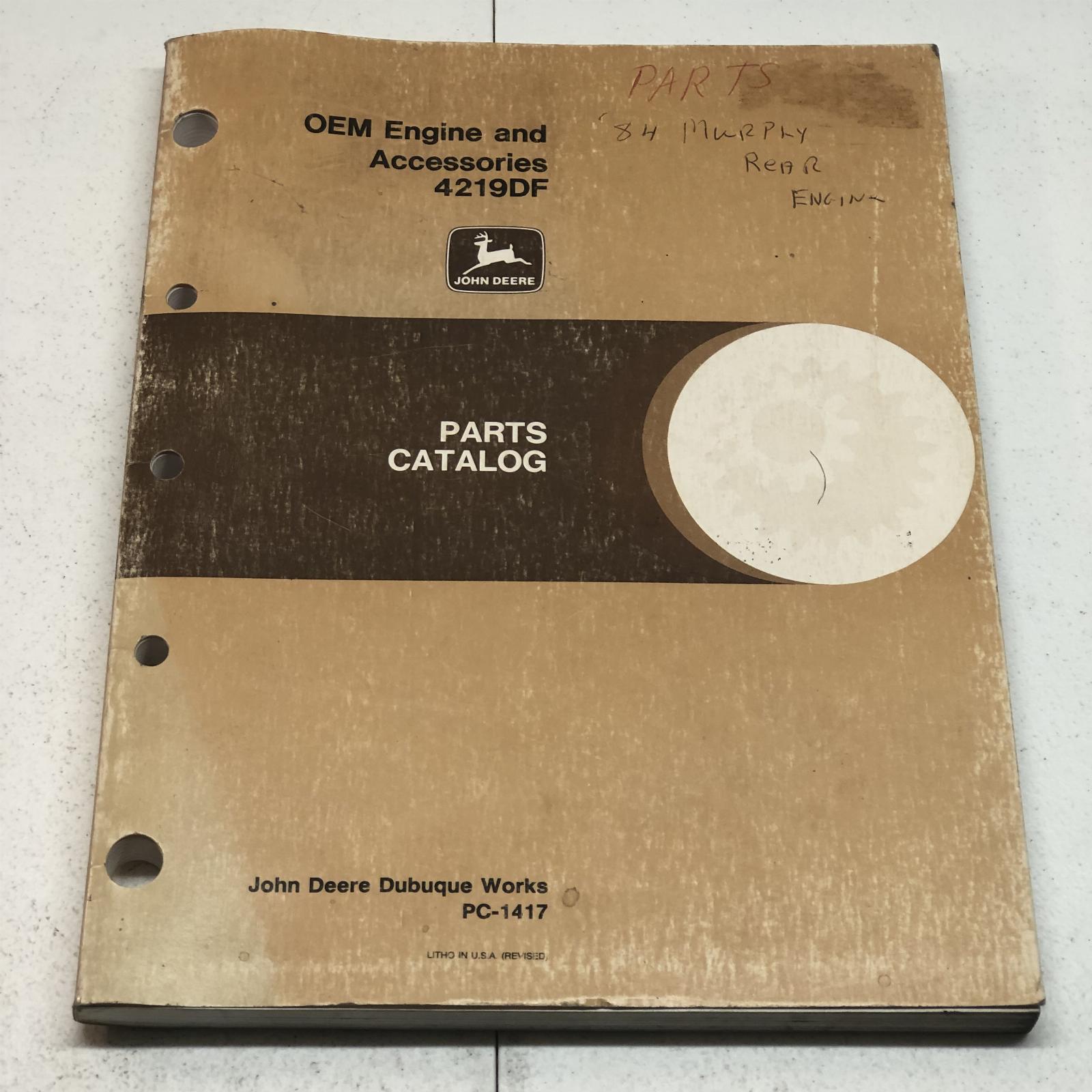 John Deere 4219DF OEM Engine & Accessories Parts Manual Part No. PC-1417 November 1989 Edition This OEM Manual is the REAL DEAL and not a reprint. I recently purchased a huge lot of manuals from a DOT Repair Facility. This manual has been used in a repair shop and may have dirt, grease, fingerprints, writing, and smudging on some pages.