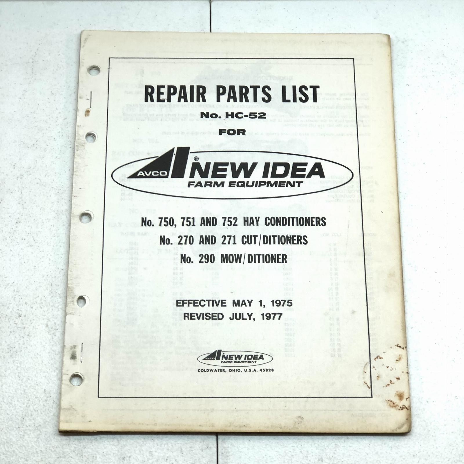 New Idea No. 750 751 752 Hay Conditioners 270 271 Cut/ Ditioners Parts Manual