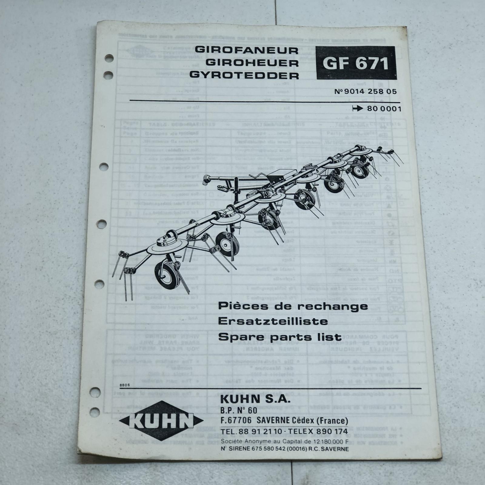 Kuhn Gyrotedder Model GF671 Hay Tedder Parts Manual