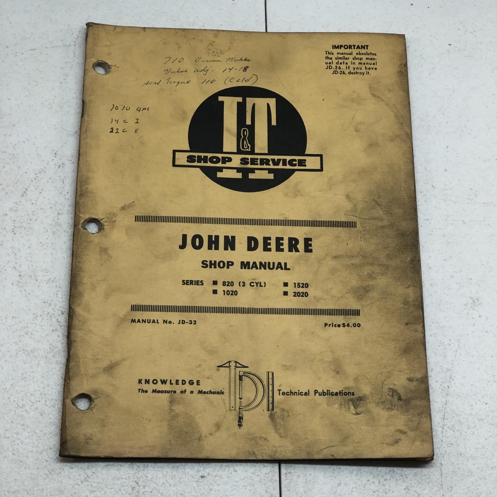 I&t JD-32 John Deere 820 (3-Cyl) 1020 1520 2020 Workshop Service Repair Manual